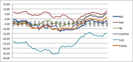 Incrociando vari basi dati: Wolleb and Wolleb (1990), Istat Conto Economico Consolidato delle Amministrazioni Pubbliche, Istat Conti Economici regionali, Ministero Tesoro, Banca d’Italia , Prometeia, il risultato, dopo un lungo lavoro, è riportato nella seguente figura: