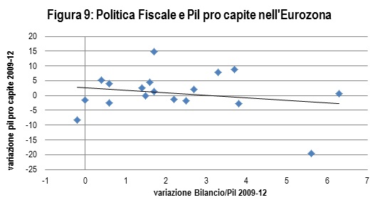 La spiegazione del differente impatto della crisi tra i paesi della zona Euro non può prescindere dalle manovre di consolidamento fiscale. La Figura 9 mostra la relazione tra la severità della stretta fiscale nel periodo 2009-12, misurata sulle ordinate dal miglioramento nel saldo di bilancio in punti di Pil, e la crescita del Pil pro capite nello stesso periodo: in media ad ogni punto percentuale di riduzione del rapporto disavanzo/Pil si associa una diminuzione di 0,84 punti del Pil pro capite.