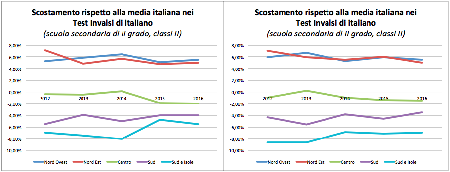 «Gli studenti del Nord Ovest (509) e del Nord Est (514) si collocano al di sopra sia della media nazionale (485) che della media OCSE (494), con una differenza statisticamente significativa; il Centro (485) è in linea con la media italiana ma sotto la media OCSE, mentre Sud e Sud Isole si collocano significativamente al di sotto delle due medie di riferimento con un punteggio medio rispettivamente di 464 e 446 così come le regioni dell’Area convergenza (Campania, Calabria, Puglia e Sicilia) con un punteggio di 454».
