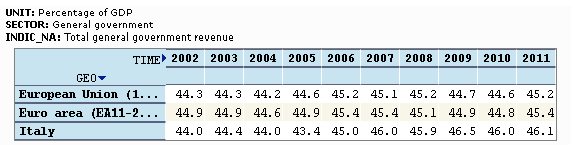 Leggete bene: nell:E.B. si è passati da 572 mld di € a 728 mld di € di tasse versate ogni anno. Any given year. + 26% sul periodo, inflazione + 2,2, nell'EB le tasse sono scresciute di uno 0,4 % annuo, leggenda dice che le abbassava...