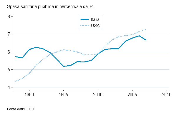 Ho elaborato i dati da un foglio inviatomi dal mio collega, Greg Huffman, che ringrazio, ma li potete trovare facilmente nel sito dell'OCSE. Cominciamo dalla figura che analizza l'andamento in percentuale del PIL. È noto che la spesa sanitaria è enorme negli USA, circa il 17% del PIL. Pochi sanno però che quasi metà di questo è a carico di programmi di stati e governo federale. Si tratta di programmi come Medicare (assistenza agli anziani), Medicaid (ai poveri), e delle spese per curare i veterani, i militari (che negli usa non sono pochi!), e per assicurare i dipendenti pubblici (anche qui, non pochi, basti pensare alla massa di insegnanti).