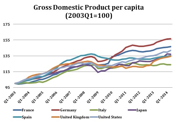 Come vedete, in termini di prodotto nazionale totale, abbiamo fatto peggio del famosissimo malato, il Giappone, sia dal 2003 che dalla crisi. E, non scordiamocelo, il Giappone è un paese in crollo demografico (quindi delle forze di lavoro) mentre l'Italia, sino all'altro giorno, aveva una popolazione (e delle forze di lavoro) crescenti. Vediamo ora il valori per capita.