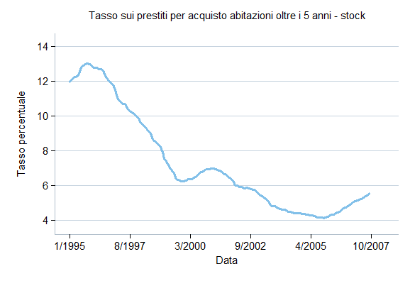 Il sottotitolo, in minore evidenza, riporta che il record si riferisce agli ultimi cinque anni. Certo, qualsiasi numero è un record in un certo ambito di riferimento. A me però 5,71% non sembra malaccio. Il mio primo mutuo lo feci nel duemila a 8,875%. Rifinanziai due anni dopo al 6,25%. Magari sono io a farmi fregare, ma non ne sono certo. Insomma, 5,71% è un valore alto o basso? Sono andato, come al solito, a guardarmi i dati, cosa che avrebbero potuto fare anche i giornalisti del Corriere, e in meno di 20 minuti fra ricerca dei dati e loro analisi ho creato la seguente figura (3 dei 20 minuti li ho persi perché non avevo capito che la Banca d'Italia formatta i numeri decimali usando la virgola e non il punto, lo standard usato da qualsiasi programma statistico che io conosca).